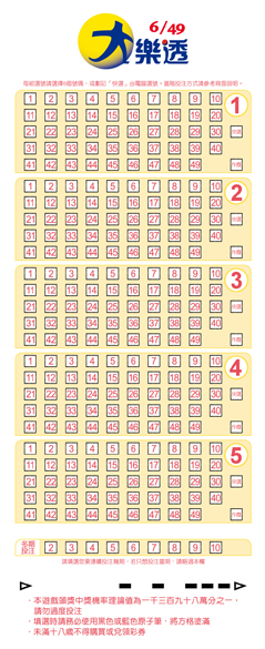 大乐透是一种乐透型游戏。您必须从01~49中任选6个号码进行投注。开奖时,开奖单位将随机开出六个号码加一个特别号,这一组号码就是该期大乐透的中奖号码,也称为「奖号」。您的六个选号中,如果有三个以上(含三个号码)对中当期开出之六个号码(特别号只适用于二奖、四奖、六奖和七奖),即为中奖,并可依规定兑领奖金。 各奖项的中奖方式如下表: